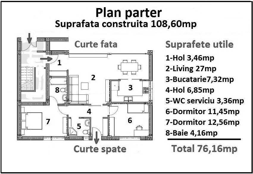 - la parter – apartament cu 3 camere cu suprafaţa construită de 108,6 m² şi teren (curte proprie) 100 m²