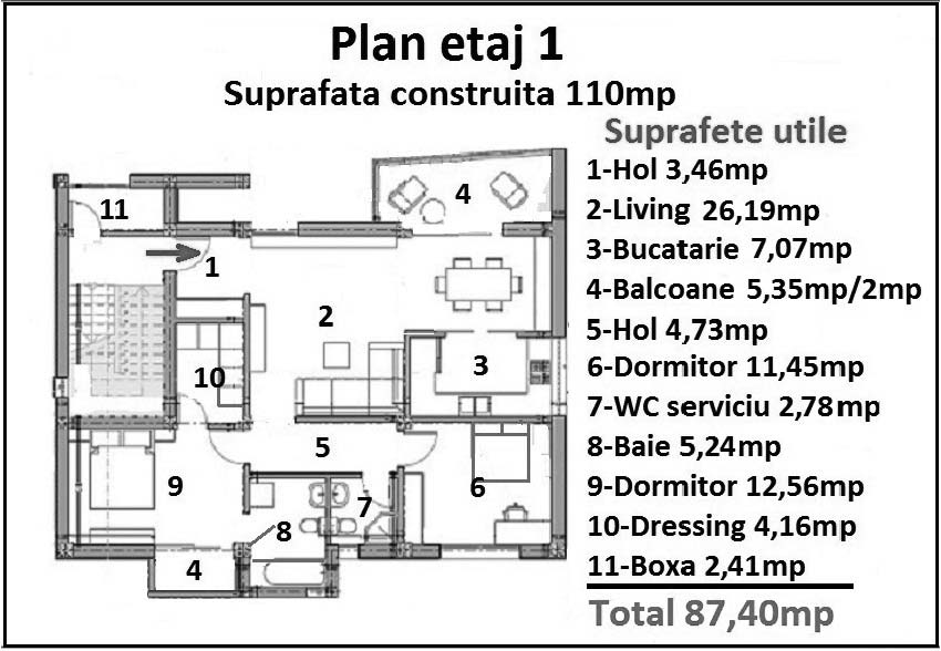 - la etaj 1 – apartament cu 3 camere cu suprafaţa construită de 110 m²
