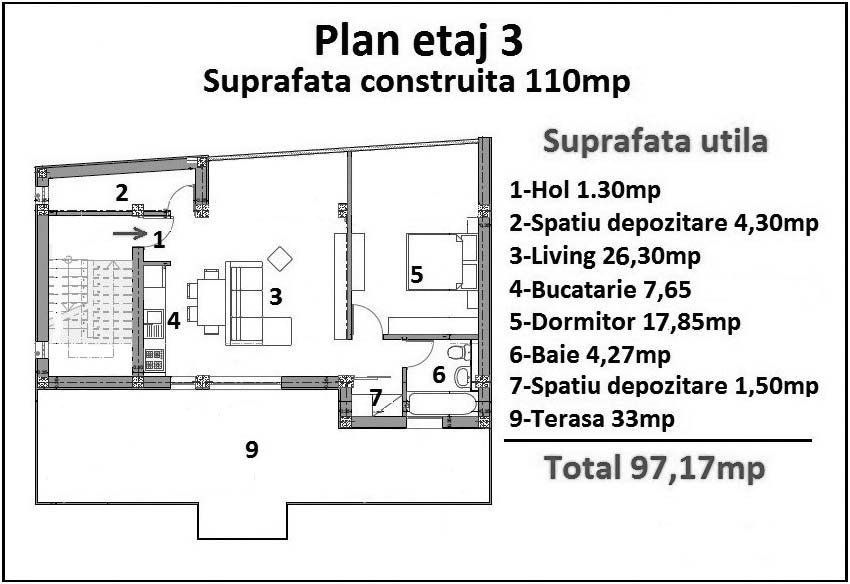 - la etaj 3 – apartament cu 2 camere (cu placa turnată şi acoperiş) cu suprafaţa construită de 110 m²